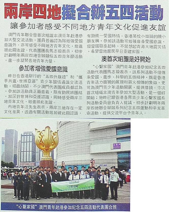 由澳門青年聯合會組織“心繫家國”澳門青年赴港參加紀念五四活動代表團,已於日前順利完成。首先感謝  貴會及  閣下對是次活動所提供協助及支持。另外,是次活動亦得到澳門日報廣泛報導,現附上相關報導,以供查閱。再次衷心感謝!